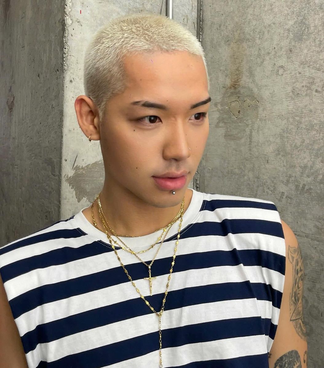 Điểm nhấn của kiểu tóc này nằm ở buzzcut tẩy trắng – tối giản nhưng đầy phá cách. Độ ngắn gọn gàng giúp phô diễn đường nét khuôn mặt, trong khi tông màu bạch kim độc lạ mang đến vẻ ngoài lạnh lùng, sắc sảo. Chính sự táo bạo đó đã biến tóc Wean Le thành biểu tượng phong cách, khẳng định hình ảnh một nghệ sĩ không ngại thử nghiệm và sống đúng với cái tôi riêng.