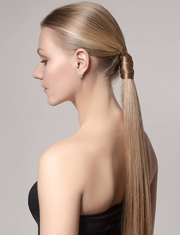 Kiểu tóc đuôi ngựa bóng mượt vẫn tiếp tục nằm trong danh sách thời trang cao cấp trên toàn thế giới. Duỗi thẳng tóc bằng thanh duỗi tóc. Chải lại thật chặt và kéo lên cao. Buộc chặt lại. Đây là một trong những kiểu tóc chính thức dễ dàng cho mái tóc dài.