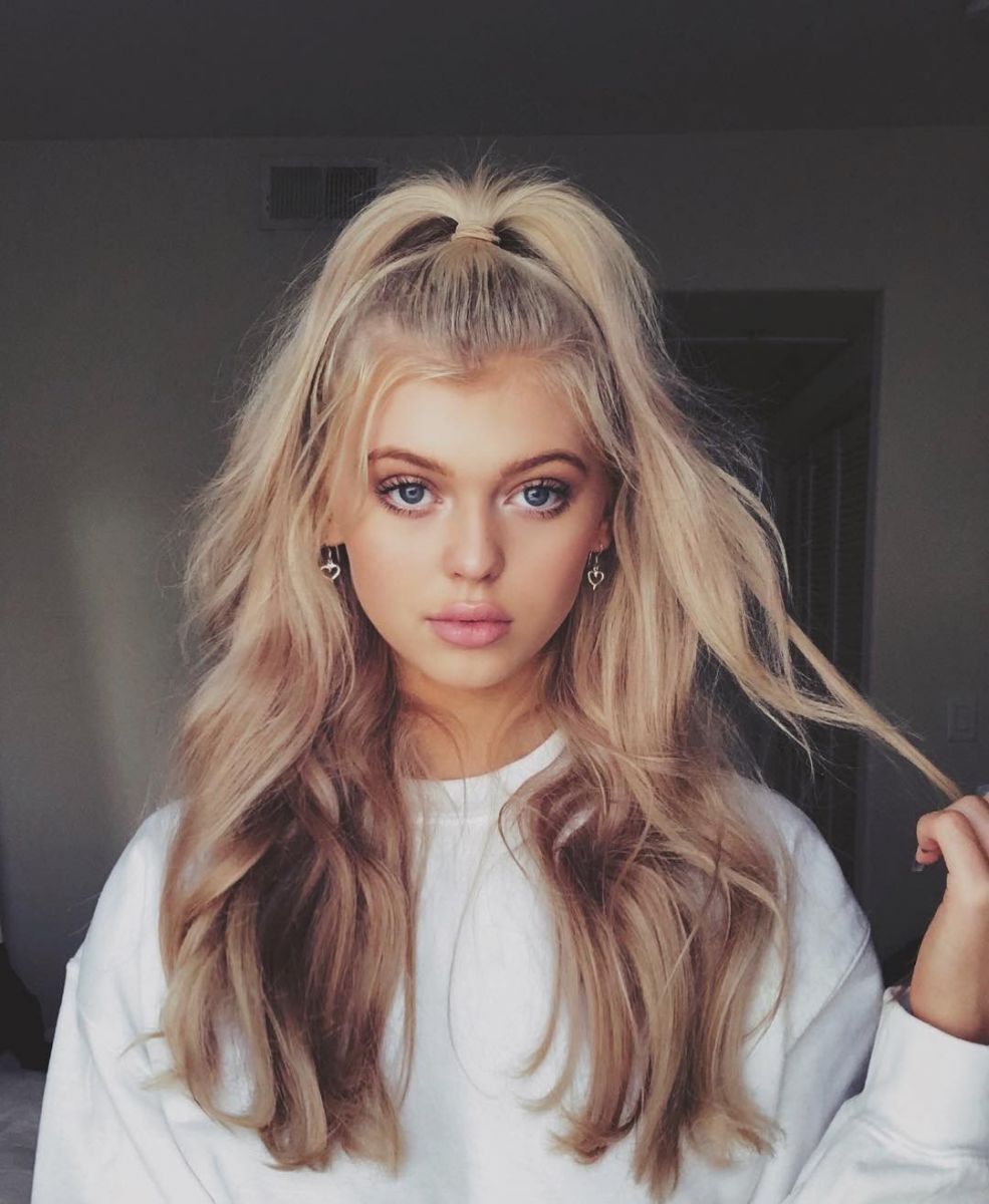 Kiểu tóc buộc nửa đầu rất được yêu thích và rất đơn giản để thực hiện. Chải tóc gọn gàng, tốt nhất là chải thẳng hoặc xõa sóng và rẽ ngôi giữa. Bắt đầu từ giữa đỉnh, kéo tóc ra sau hơi dựng lên, giống như phồng và ghim ở phía sau. Bây giờ lấy tóc từ hai bên và đưa nó trở lại nơi bạn đã ghim phần tóc phồng. Để lại phần tóc còn lại mở.
