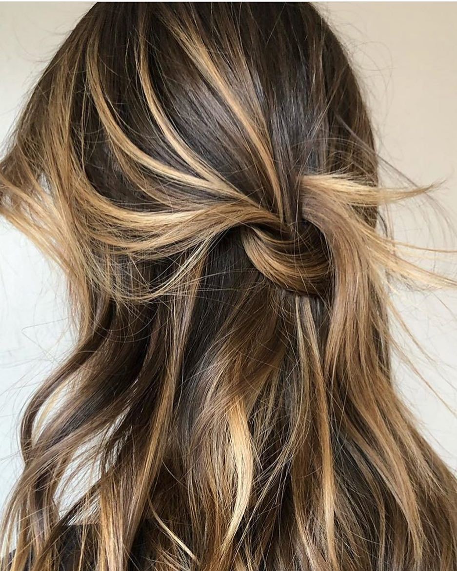 Khi nói đến việc tạo kiểu cho tóc nhuộm vàng trên mái tóc nâu sẫm, điều quan trọng là bạn không nên nhuộm quá sáng với nhuộm tóc nhuộm sáng. Những sợi tóc vàng óng được vẽ thủ công xuyên qua mái tóc màu nâu gụ sẫm tạo nên vẻ ngoài trẻ trung và lộng lẫy.