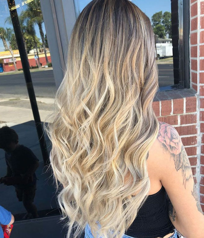 Nếu bạn đang tìm kiếm một sự lột xác ấn tượng, thì ấn tượng chính xác là những gì bạn sẽ nhận được với diện mạo balayage toàn diện này. Màu vàng bạch kim sáng quét khắp mái tóc của cô ấy thậm chí còn được làm nổi bật hơn với sự trợ giúp của phần gốc bóng màu nâu sẫm ở trên cùng.