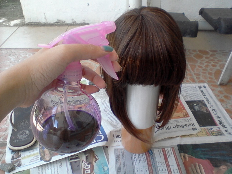 Đầu tiên, trộn màu và nước có cồn với tỉ lệ bằng nhau, sau đó trộn thật đều hỗn hợp. Tùy vào độ dày và dài của tóc giả mà bạn cho lượng nước và mức sao cho vừa đủ nhé.
