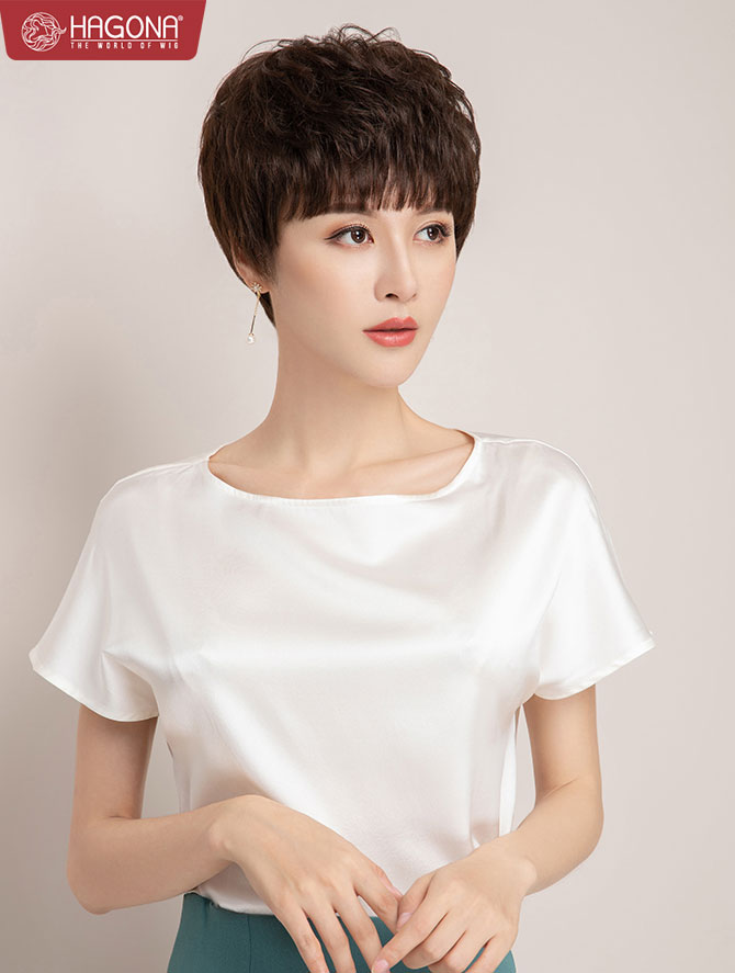 Tóc giả nữ trung niên giúp các chị, các cô che đi phần tóc bạc hoặc tóc hói mang đến nét trẻ trung và thanh lịch. Tóc giả cho độ tuổi này cần sự đơn giản, tinh tế, tao nhã nhưng vẫn sang trọng. Các chị hãy chọn mẫu tóc ngắn tém hoặc tóc ngang vai được uốn cụp hoặc xoăn lọn nhỏ, phần mái là mái chéo để gương mặt được thanh thoát hơn nhé.