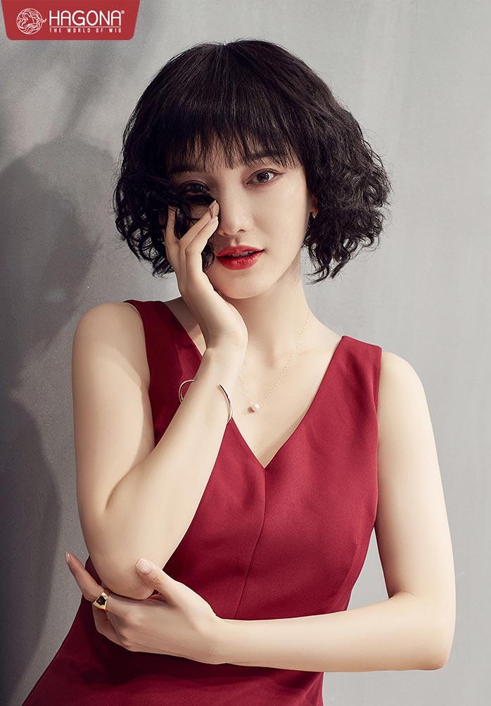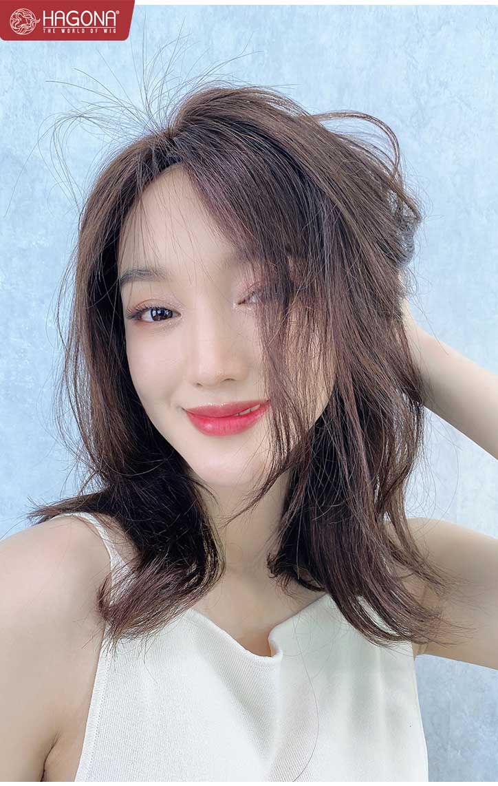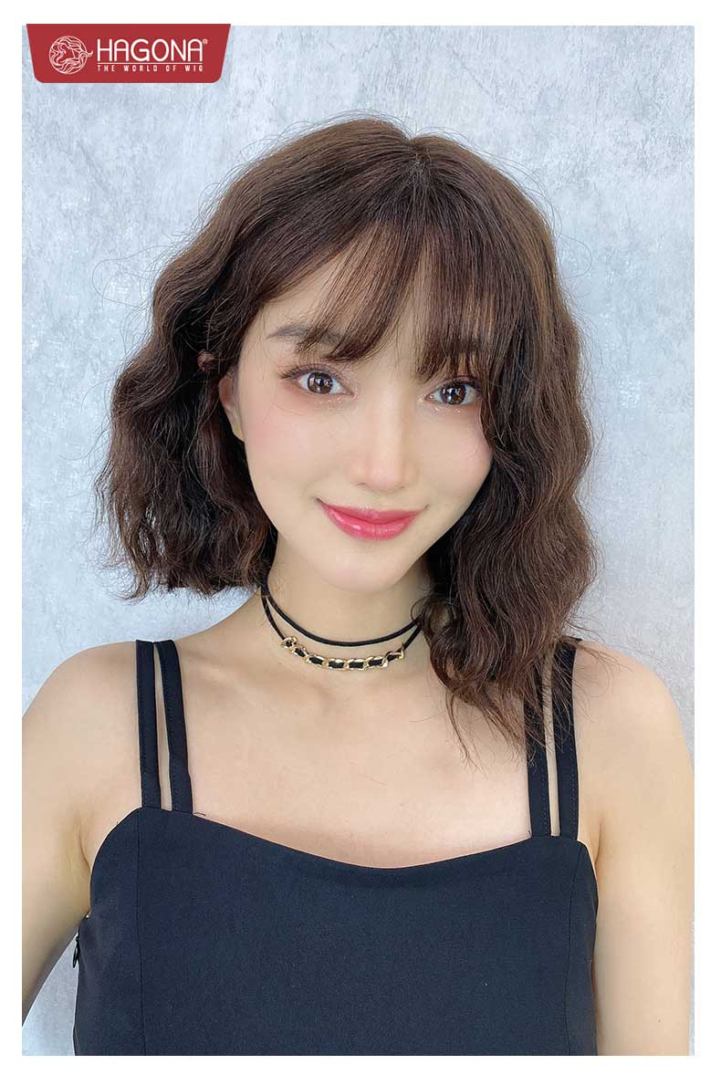 Tóc giả cho nữ mặt tròn uốn cụp mái thưa trẻ trung