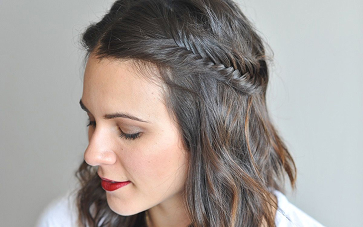 Đây có lẽ là một trong các kiểu tóc đi đám cưới phù hợp nhất với những cô nàng tóc ngắn. Không tết hoàn toàn mái tóc, mà chỉ cần lấy một chút phần tóc mái, tết dần dần từ nơi đỉnh đầu, men theo trán đến vành tai, cố định được ngọn tóc rồi dùng kẹp nhỏ ghim dấu dưới phần tóc còn lại là ok.