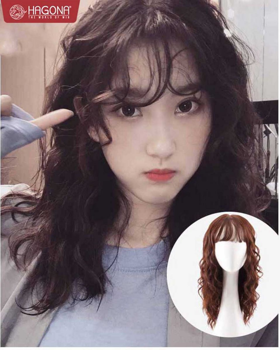 Kiểu tóc dài xoăn sóng to mái thưa này tạo nên sự uyển chuyển nhẹ nhàng trên khuôn mặt và sẽ giúp bạn che bớt đi phần trán cao rộng cùng xương quai hàm góc cạnh. Vậy nên đây sẽ là một trong những mẫu tóc giả nữ đẹp 2021 giúp các nàng xinh đẹp và thời thượng hơn. Để nổi bật có thể kết hợp với nhuộm màu nhé.