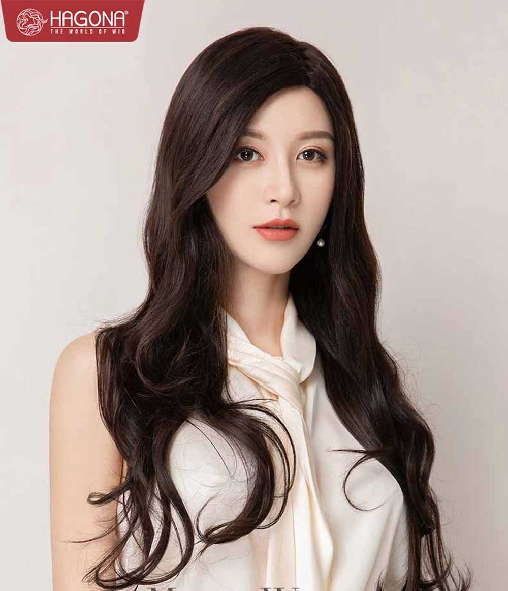 Nếu bạn yêu thích vẻ ngoài quyến rũ và “sang chảnh” thì đừng chần chừ hãy thử ngay kiểu tóc dài xoăn lơi mái lệch này nhé. Mẫu tóc giả nữ này sẽ giúp che đi khuôn mặt và phần trán rộng, tạo sự cân đối và thon gọn hơn. Đây là kiểu tóc mà rất nhiều sao nữ nổi tiếng thế giới theo đuổi, điều đó đã chứng minh sức hút của nó rồi đúng không?
